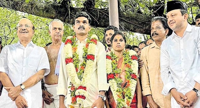 അഗതി മന്ദിരത്തിലെ അന്തേവാസി ഗിരിജ ഇന്നലെ രാകേഷിന്റെ കൈപിടിച്ചു; അമ്മാഞ്ചേരി ക്ഷേത്രത്തിൽ നടന്ന വിവാഹത്തിന് ആതിഥേയരായി യൂത്ത് ലീഗ് പ്രവർത്തകർ, മലപ്പുറത്തിന്റെ മതസൗഹാർദ പാരമ്പര്യത്തിനു മറ്റൊരു തിലകക്കുറി