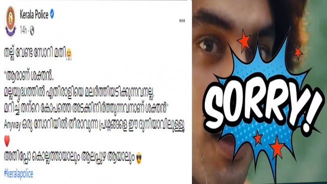 നിസാര കാര്യങ്ങളെ ചൊല്ലി തമ്മിലിടക്കുന്നവര്ക്ക് ഉപദേശവുമായി കേരള പൊലീസിന്റെ ഫേസ്ബുക് പോസ്റ്റ്. 'തല്ല് വേണ്ട, സോറി മതി, അതിനി കൊല്ലത്ത് ആയാലും ആലപ്പുഴ ആയാലുമെന്നാണ് കേരള പൊലീസ് നല്കുന്ന ഉപദേശം. ഫേസ്ബുക്കിലൂടെയാണ് പൊലീസ് അടിപിടിയുണ്ടാക്കുന്നവര്ക്ക് ഉപദേശവുമായി എത്തിയത്. അടുത്തിടെ കൊല്ലത്തും ആലപ്പുഴയിലുമൊക്കെയുണ്ടായ അടിപിടിക്കേസുകള് സമൂഹമാധ്യമങ്ങളില് വൈറലായിരുന്നു.