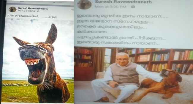 തിങ്കളാഴ്ച ഗവർണർ പത്ര സമ്മേളനം നടത്തിയപ്പോൾ തന്നെയാണ് ഗവർണ്ണറെ അപമാനിക്കുന്ന രീതിയിൽ ആദ്യം സുരേഷ് ഫെയ്സ്ബുക്ക് പോസ്റ്റ് പങ്കു വച്ചത്. പത്രസമ്മേളനത്തിൽ കഴുത എന്നതായിരുന്നു ഒരു കഴുതയുടെ ചിത്രം സഹിതം ആദ്യത്തെ പോസ്റ്റ്. പിന്നാലെ, തിങ്കളാഴ്ച ഉച്ചയ്ക്ക് മൂന്നു മണിയോടെ രണ്ടാമത്തെ പോസ്റ്റും ഇട്ടു - ഇതൊരുമുന്തിയ ഇനം നായയാണ്. ഇത്ര യജമാന സ്നേഹമുള്ള, ഉറക്കെ കുരയ്ക്കുമെങ്കിലും കടിക്കാത്ത.. ചുവപ്പ് കണ്ടാൽ ഭ്രാന്ത് പിടിക്കുന്ന ഇതൊരു സങ്കരയിനം നായയാണ്. എന്നായിരുന്നു പോസ്റ്റ്.