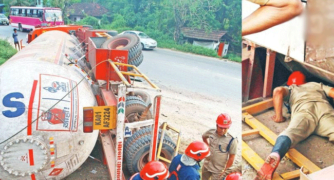 പക്ഷേ പതിവിന് വിപരീതമായി ചൊവ്വാഴ്ച വൈകീട്ട് മൊബൈൽ നോക്കിയിരുന്നതിനാൽ ജീവൻ രക്ഷപ്പെട്ടന്നാണ് ഇവർ പറയുന്നത്. മാത്രമല്ല ടയർ കടയ്ക്ക് മുന്നിലേക്കാണ് ടാങ്കർ മറിഞ്ഞുകിടക്കുന്നത്. കടയ്ക്കുമുന്നിലുണ്ടായിരുന്ന ടയറുകളും ഉപകരണങ്ങളും ടാങ്കറിനടിയിലാണ്. തുടർന്ന് ടാങ്കർ എടുത്തുമാറ്റിയാലേ നാശനഷ്ടങ്ങൾ അറിയൂ.