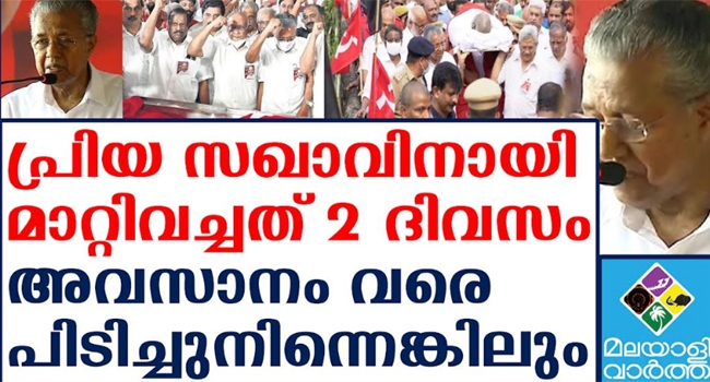 അഞ്ച് പതിറ്റാണ്ടിലേറെ കാലം ഒപ്പമുണ്ടായിരുന്ന സഹോദരനെയാണ് മുഖ്യമന്ത്രിക്ക് നഷ്ടമായത്. ഏത് നേതാവിന്റെയും വിയോഗം കൂട്ടായ പരിശ്രമത്തിലൂടെ പരിഹരിക്കാറാണ് പതിവ്. എന്നാല് ഇത് പെട്ടെന്ന് പരിഹരിക്കാനാവുന്ന വിയോഗമല്ല. പക്ഷെ ഞങ്ങളത് കൂട്ടായ പ്രവര്ത്തനത്തിലൂടെ നികത്താനാണ് ശ്രമിക്കുക. ഞാന് നേരത്തെ പറഞ്ഞതുപോലെ....... അവസാനിപ്പിക്കുന്നു, എന്ന് പറഞ്ഞ് മുഖ്യമന്ത്രി പ്രസംഗം നിര്ത്തി.