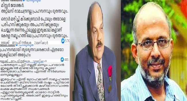 പ്രഹസനമായി ആരംഭിച്ച് ദുരന്തമായി അവസാനിച്ച രാമചന്ദ്രന് ആദരാഞ്ജലി; ''ഒരാൾ മരിച്ച് കിടക്കുമ്പോൾ പോലും അയാളെ പരിഹസിക്കുകയും അപഹസിക്കുകയും ചെയ്യുന്ന തന്നെപ്പോലുള്ള ഇരുകാലികളാണ് കേരള സമൂഹത്തിലെ പ്രഹസനവും ദുരന്തവും'' ''ഇങ്ങനെ വൃത്തികേട് പറയരുത് എൽ എൽ ബിക്കാരാ''; അറ്റ്ലസ് രാമചന്ദ്രന് ആദരാഞ്ജലികൾ നേർന്ന എ ജയശങ്കറെ പൊങ്കാലയിട്ട് സോഷ്യൽ മീഡിയ