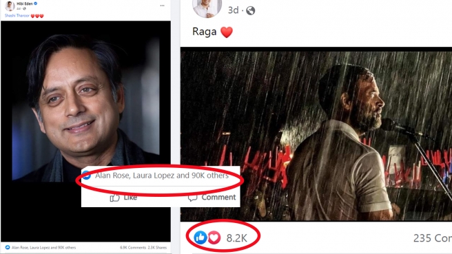 ഹൈബിയെ മാത്രമല്ല കോണ്ഗ്രസ് നേതാക്കളെയെല്ലാം ഞെട്ടിച്ചു കൊണ്ടാണ് ഹൈബിയുടെ പോസ്റ്റിന് ലൈക്കും ഷെയറും കിട്ടിയിരിക്കുന്നത്. രണ്ട് ദിവസം കൊണ്ട് തൊണ്ണൂറായിരം പേരാണ് ചിത്രം ലൈക്ക് ചെയ്തത്.രണ്ടായിരത്തി മുന്നൂറ് പേര് ചിത്രം ഷെയര് ചെയ്തു. ഏഴായിരത്തോളം കമന്റും ലഭിച്ചു. ഹൈബിയെ പോലും ഞെടട്ിച്ചു കൊണ്ടാണ് ഇത്രയും വലിയ പ്രതികരണം അദ്ദേഹത്തിന്റെ ഒരു പോസ്റ്റിന് ലഭിക്കുന്നത്. സാധാരണ ഹൈബിയുടെ പോസ്റ്റുകള് നാലായിരം അയ്യായിരം ലൈക്കുകളില് ഒതുങ്ങുന്നതാണ്. കോണ്ഗ്രസിലെ സാധാരണ പ്രവര്ത്തകരാണ് ശശിതരൂരിന്റെ ചിത്രത്തിന് ലൈക്കും കമന്റും ചെയ്തിട്ടുള്ളതെന്നതും ശ്രദ്ധേയമാണ്.