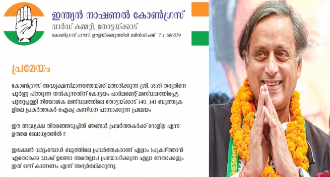 ഇലക്ഷൻ വരുമ്പോൾ ബൂത്തിലെ പ്രവർത്തക്കാരാണ് എല്ലാം എന്ന് പറയുന്ന നേതാക്കൾ കാണാൻ...!ഉമ്മൻചാണ്ടിയുടെ തട്ടകത്തിൽ തരൂരിനെ അനുകൂലിച്ച് പ്രമേയം...കോൺഗ്രസിന്റെ വളർച്ചയ്ക്ക് തരൂർ അധ്യക്ഷനാകണം... പ്രമേയം ഇങ്ങനെ...