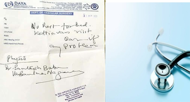 ഇവിടത്തെ വാസ്കുലർ സർജറി വിഭാഗത്തിലെ കൺസൾട്ടന്റ് ഡോ. റോയ് വർഗീസാണ് അപഹസിക്കും വിധം കുറിപ്പെഴുതി നൽകിയത്. വടക്കേക്കാട് പ്രാഥമികാരോഗ്യകേന്ദ്രത്തിൽ ജീവനക്കാരിയായ പ്രിയയ്ക്ക് രണ്ടു വർഷത്തിലേറെയായി കാലിന് വേദനയുണ്ട്. വ്യാഴാഴ്ച ഉച്ചയ്ക്കാണ് ഇവർ തൃശ്ശൂരിലെ ആശുപത്രിയിൽ എത്തിയത്. വേദനയുണ്ടെന്ന് പറഞ്ഞപ്പോൾതന്നെ എക്സ്റേ എടുക്കാനായിരുന്നു നിർദേശം.