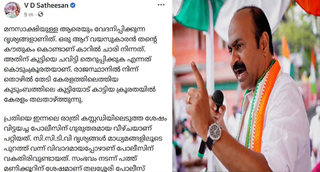 'ഒരു ആറ് വയസുകാരൻ തന്റെ കൗതുകം കൊണ്ടാണ് കാറിൽ ചാരി നിന്നത്. അതിന് കുട്ടിയെ ചവിട്ടി തെറിപ്പിക്കുക എന്നത് കൊടുംക്രൂരതയാണ്. രാജസ്ഥാനിൽ നിന്ന് തൊഴിൽ തേടി കേരളത്തിലെത്തിയ കുടുംബത്തിലെ കുട്ടിയോട് കാട്ടിയ ക്രൂരതയിൽ കേരളം തലതാഴ്ത്തുന്നു...' പ്രതിപക്ഷ നേതാവ് വി.ഡി.സതീശൻ