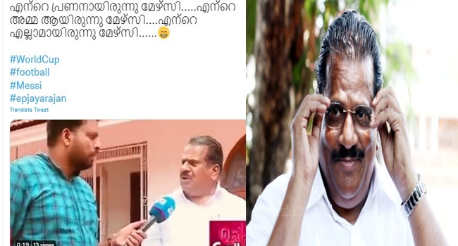 മുന് കായിക മന്ത്രിയും നിലവിലെ എല്ഡിഎഫ് കണ്വീനറുമായ ഇ.പി. ജയരാജന് ട്രോളര്മാരുടെ പൊന്നോമന എന്നാണ് സമൂഹമാധ്യമത്തിൽ അറിയപ്പെടുന്നത്. ഈ പ്രാവശ്യം ലോകകപ്പ് ഫുട്ബോളിന്റെ പശ്ചാത്തലത്തില് വാര്ത്ത ചാനലിന് നല്കിയ പ്രതികരണത്തിലാണ് ട്രോളുകളില് നിറയുന്നത്.