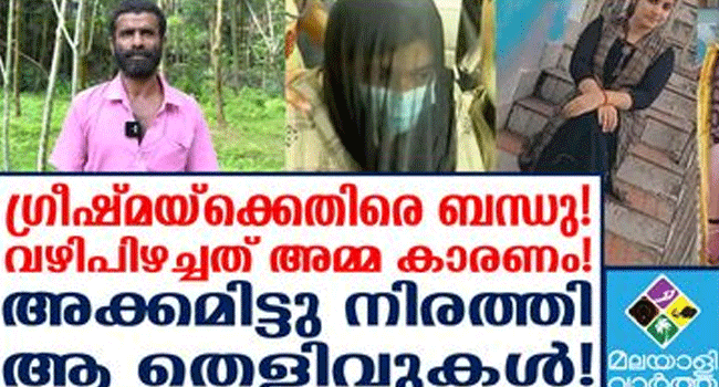 ഗ്രീഷ്മയ്ക്കെതിരെ ബന്ധു! വഴിപിഴച്ചത് അമ്മ കാരണം!അക്കമിട്ടു നിരത്തിആ തെളിവുകൾ! ആ പറഞ്ഞതെല്ലാം പച്ചകള്ളം! ഇവിടെ 10 സെന്റ് വാങ്ങാൻ പറ്റാത്തവരാണോ മദ്രാസിൽ പോയി വാങ്ങുന്നത്, ഗ്രീഷ്മ പറഞ്ഞ പ്രോപ്പർട്ടിയുടെ കാര്യമെല്ലാം നുണ; ഗ്രീഷ്മയുടെ വീട്ടിൽ അച്ഛനു യാതൊരു സ്ഥനവുമില്ല , അമ്മയാണ് വീട് ഭരിക്കുന്നത്; നാട്ടുകാരുടെ മുഖത്ത് നോക്കാനാകാതെ അച്ഛൻ തേങ്ങി കരയുകയാണ്!