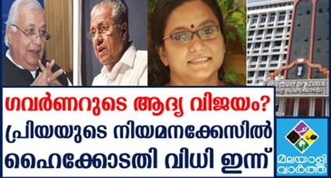 ഗവര്ണറുടെ തീരുമാനം ശരിയായിരുന്നോ എന്ന് ഇന്ന് അറിയാം. പ്രിയ വര്ഗീസിനെ കണ്ണൂര് സര്വകലാശാല മലയാളം വിഭാഗത്തില് അസോസിയേറ്റ് പ്രൊഫസര് ആയി നിയമിക്കാനുള്ള നീക്കം ചോദ്യം ചെയ്തുള്ള ഹര്ജിയില് ഹൈക്കോടതി ഇന്ന് വിധിപറയും.