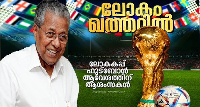 ഖത്തറിൽ നടക്കുന്ന ഫുട്ബോൾ ലോകകപ്പിന് ആശംസ നേർന്ന് മുഖ്യമന്ത്രി പിണറായി വിജയൻ... ഖത്തറിൽ അരങ്ങേറുന്ന ഫുട്ബോൾ ലോകകപ്പിന്റെ ആഘോഷത്തിലാണ് നാടാകെ... മലയാളികളുടെ ഫുട്ബോൾ പ്രേമം പ്രസിദ്ധമാണ്...ലോകകപ്പ് ഏവർക്കും ആസ്വദിക്കാൻ സാധിക്കട്ടെ എന്ന് മുഖ്യമന്ത്രിയുടെ ആശംസ