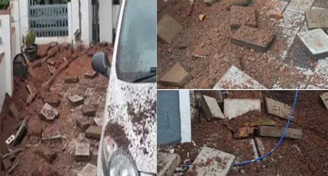 ഇടിമിന്നലേറ്റ് ഇരുനില വീട് തകർന്നു; മുൻവശത്തെ മതിൽ പൂർണമായും തകർന്നു; ഇന്റർലോക്ക് കട്ടകളും മേൽക്കൂരയിൽ പാകിയ ഓടും പൊട്ടിത്തെറിച്ചു; കാറിനും വൈദ്യുതോപകരണങ്ങൾക്കും തകരാറ് സംഭവിച്ചിട്ടുണ്ട്