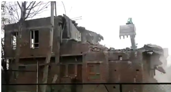 ജമ്മു കശ്മീരിൽ ഭീകരർക്കെതിരായ ബുൾഡോസർ നടപടി ആരംഭിച്ചു; പുൽവാമയിലെ ഒരു ഭീകരന്റെ വീട് അധികൃതർ തകർത്തു