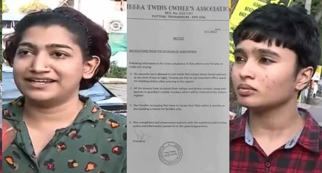 അവിവാഹിതകളായ താമസക്കാർ രണ്ടുമാസത്തിനകം ഫ്ളാറ്റ് ഒഴിയണമെന്ന് നിർദ്ദേശം നൽകിയ സംഭവത്തിൽ വഴിത്തിരിവ്. സംഭവത്തിൽ യുവതികൾക്ക് പിന്തുണയുമായി ഫ്ളാറ്റ് ഉടമ രംഗത്തെത്തി. ഫ്ളാറ്റിലെ താമസക്കാരായ ഗോപികയോടും ദുർഗയോടും ഒഴിയേണ്ടതില്ലെന്ന് ഫ്ളാറ്റ് ഉടമ അറിയിച്ചു.