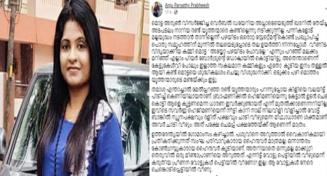 കേരളത്തിൽ ജാതിയുടെ പേരിൽ നടക്കുവരുന്ന വാദപ്രതിവാദങ്ങൾക്കെതിരെ കടുത്ത പ്രതികരണവുമായി രംഗത്ത് എത്തിയിരിക്കുകയാണ് അഞ്ജു പാർവതി. 'അയ്യപ്പ ശരണമന്ത്രം ചൊല്ലിയതിൻ്റെ പേരിൽ ദിവൃ എസ് അയ്യർ നേരിട്ട സൈബർ ബുള്ളിയിങ് കണ്ടില്ലെന്നു വച്ചാലും പഴയിടം വിളമ്പുന്ന ഭക്ഷണത്തിലെ ജാതീയതയെ ചാരി നാല് ഇല്ലാ വചനം പറഞ്ഞില്ലെങ്കിൽ സമാധാനമില്ല' എന്നും അവർ കുറിക്കുകയാണ്.