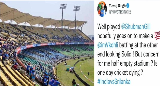 ഏകദിനക്രിക്കറ്റിന് അന്ത്യമായോ എന്ന് യുവ ക്രിക്കറ്റ് താരം യുവരാജ് സിങ്ങ് തന്റെ ട്വിറ്ററിലൂടെ ഈ ആശങ്ക പങ്കുവെച്ചു. ".ഒരു തലയ്ക്കല് നന്നായി കളിക്കുന്ന ശുഭ്മാന് ഗില് സെഞ്ചറിയടിക്കും. മറ്റേ തലയ്ക്കല് വിരാട് കോലി ഉറച്ച് നിന്ന് പൊരുതുന്നു. പക്ഷെ പാതി ഒഴിഞ്ഞ സ്റ്റേഡിയം കാണുമ്പോള് ആശങ്കയുണ്ട്. ഏകദിന ക്രിക്കറ്റ് മരിയ്ക്കുകയാണോ?"- ട്വീറ്റില് യുവരാജ് സിങ്ങ് കുറിച്ചു.