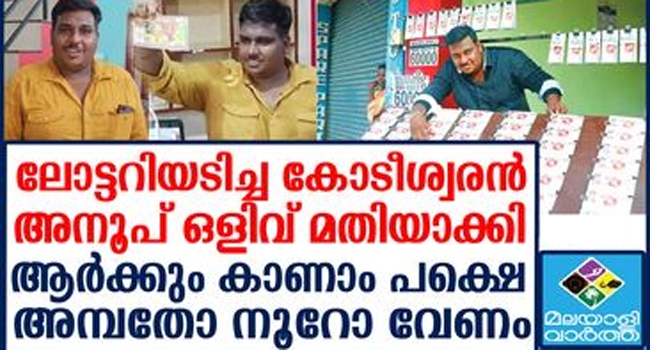 15.70 കോടി രൂപയാണ് സമ്മാനത്തുകയായി ലഭിച്ചത്. അതില്നിന്ന് മൂന്ന് കോടിയോളം നികുതിയിനത്തില് നല്കി. അനൂപിന് പണം കൈകാര്യംചെയ്യുന്നതില് പരിശീലനം നല്കാമെന്ന് ലോട്ടറിവകുപ്പ് വാഗ്ദാനം ചെയ്തിരുന്നെങ്കിലും നടപ്പാക്കിയില്ല.
