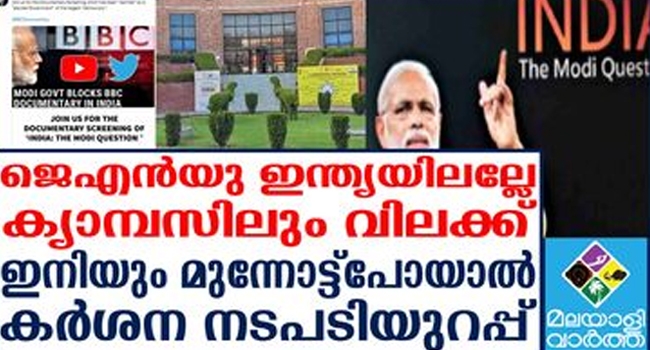 ജെഎന്യു ഉണ്ടാക്കുന്ന പൊല്ലാപ്പ്... രാജ്യത്തെ അപമാനിക്കാന് പടച്ചുണ്ടാക്കിയ ഡോക്യുമെന്ററി ഇന്ത്യയില് വിലക്കിയതിനെ വെല്ലുവിളിച്ച് ജെഎന്യു; ബിബിസി ഡോക്യുമെന്ററി ക്യാമ്പസില് പ്രദര്ശിപ്പിക്കാനുള്ള നീക്കം തടഞ്ഞ് ജെഎന്യു സര്വകലാശാല; ഡോക്യുമെന്ററി പ്രദര്ശിപ്പിച്ചാല് നടപടിയുറപ്പ്
