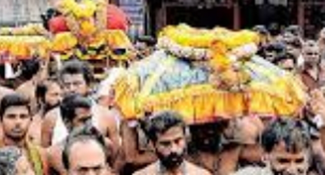 ശബരിമലയില് അയ്യപ്പന് ചാര്ത്താന് കഴിഞ്ഞ 12ന് പന്തളത്തുനിന്ന് തിരുവാഭരണങ്ങളുമായി പുറപ്പെട്ട ഘോഷയാത്ര മകരവിളക്ക് ഉത്സവത്തിന് ശേഷം പന്തളത്തു തിരികെയെത്തി. ഇന്നലെ രാവിലെ എട്ടു മണിയോടെ പന്തളത്തെത്തിയ സംഘത്തെ വലിയ പാലത്തിലെത്തിയപ്പോള് വലിയകോയിക്കല് ക്ഷേത്രോപദേശക സമിതി പ്രസിഡന്റ് പൃഥ്വിപാലിന്റെ നേതൃത്വത്തില് സ്വീകരിച്ചു.