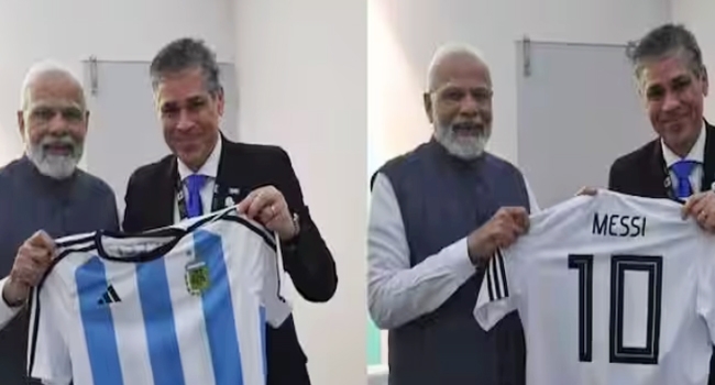 ഇന്ത്യൻ പ്രധാനമന്ത്രി നരേന്ദ്ര മോദിക്ക് ഇതിഹാസ താരം ലിയോണൽ മെസ്സിയുടെ ജഴ്സി സമ്മാനിച്ച് അർജന്റീനൻ കമ്പനി വൈപിഎഫ്... ബെംഗളൂരുവിൽ നടന്ന ഇന്ത്യ എനർജി വീക്കിന്റെ ഭാഗമായി വൈപിഎഫ് പ്രസിഡന്റ് പാബ്ലോ ഗോൺസാലസാണ് മോദിക്ക് മെസ്സിയുടെ ജേഴ്സി സമ്മാനിച്ചത്...ഖത്തർ ലോകകപ്പ് ഫൈനലിൽ ആവേശകരമായ മത്സരത്തിൽ ഫ്രാൻസിനെ തോൽപ്പിച്ച് കിരീടം നേടിയതിന് പിന്നാലെ അർജന്റീനയെയും മെസ്സിയെയും മോദി അഭിനന്ദിച്ചിരുന്നു....