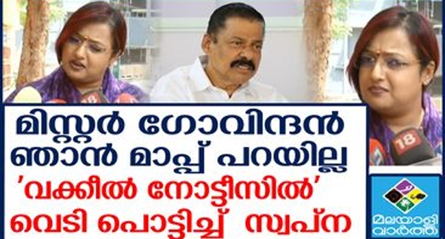 എന്തിനാണ് എനിക്ക് വക്കീൽ നോട്ടീസ് അയച്ചത്? നോട്ടീസ് കിട്ടുമ്പോൾ എന്റെ വക്കീലിനോട് പ്രതികരിക്കാൻ പറയും; മിസ്റ്റർ ഗോവിന്ദൻ ഞാൻ മാപ്പ് പറയണമെങ്കിൽ ഒരിക്കൽ കൂടി ജനിക്കണം; എന്റെ മനസ്സാക്ഷി അനുസരിച്ച് ഞാൻ തെറ്റ് ചെയ്തിട്ടില്ല; ഞാൻ നിങ്ങളോട് മാപ്പ് പറയാൻ പോകുന്നില്ല; പൊട്ടിത്തെറിച്ച് സ്വപ്ന സുരേഷ്