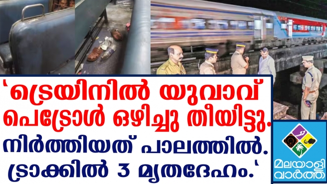 സംഭവം കേരളത്തില്....ട്രെയിന് യാത്രയ്ക്കിടെ യുവാവ് രാത്രി കോച്ചില് പെട്രോള് ഒഴിച്ചു തീകൊളുത്തി; ഭയന്നുവിറച്ച് യാത്രക്കാര്, കൂട്ടനിലവിളി; ട്രെയിന് നിര്ത്തിയത് പാലത്തിന് മുകളില്; രണ്ടു മണിക്കൂറിനു ശേഷം സ്ത്രീയുടെയും കുഞ്ഞിന്റെയും പുരുഷന്റെയും മൃതദേഹം റെയില്വേ ട്രാക്കില്