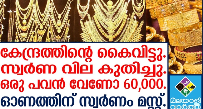 മഞ്ഞളിച്ച് കല്യാണക്കാര്... സ്വര്ണവില കുറയുമെന്ന് ബജറ്റില് പ്രഖ്യാപിച്ചെങ്കിലും കുതിക്കുന്നു; ഒരു പവന് 60,000 രൂപ നല്കേണ്ട അവസ്ഥ, കേന്ദ്രം ഇടപെട്ടിട്ടും സ്വര്ണ വില കുറയുന്നില്ല
