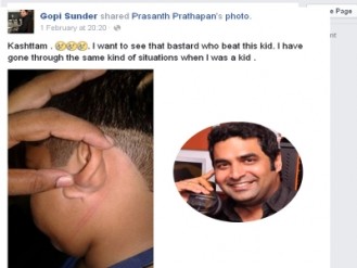 മര്ദ്ദനമേറ്റ കുട്ടിയുടെ ഫോട്ടോയും ഗോപി സുന്ദര് ഷെയര് ചെയ്തിട്ടുണ്ട്. ഈ ക്രൂരത കാട്ടിയ സ്കൂള് പ്രിന്സിപ്പലിന്റെ നമ്പരുണ്ടെങ്കില് ആരെങ്കിലും പറഞ്ഞു തരണമെന്നും തന്തയില്ലാത്ത ആ പ്രിന്സിപ്പലിനെ തനിക്കൊന്ന് കാണണമെന്നുമാണ് ഗോപി സുന്ദര് ഫേസ്ബുക്കിലൂടെ പറഞ്ഞത്.