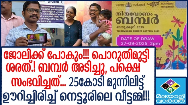 ‘ഭാഗ്യക്കുറി അടിച്ചെന്നു കരുതി ഒന്നിനും ഒരുമാറ്റവുമുണ്ടാകില്ല. ചൊവ്വാഴ്ച മുതൽ ജോലിക്കു പോകും. 12 വർഷമായി അവിടെ ജോലി ചെയ്യുന്നു. ഒരുദിവസത്തെ അവധി പറഞ്ഞാണു പോന്നത്. അവരോടും ഒന്നും പറഞ്ഞിരുന്നില്ല... ഇത്തവണത്തെ തിരുവോണം ബമ്പർ നറുക്കെടുപ്പിൽ ഒന്നാം സമ്മാനമാടിച്ച ചേർത്തല തൈക്കാട്ടുശ്ശേരി നെടുംചിറ വീട്ടിൽ ശരത് എസ്. നായരുടെ വാക്കുകളാണിത്. 500 രൂപ മാറ്റിവെക്കാൻ പലപ്പോഴും കഴിയാറില്ല. അതിനാൽ ഇതുവരെ ബമ്പറെടുത്തിട്ടില്ല. അപ്പോഴാണ് ഇത്തവണത്തെ തിരുവോണം ബമ്പർ നറുക്കെടുപ്പു മാറ്റിവെച്ച വാർത്തയറിഞ്ഞത്. എന്നാൽ, ഇത്തവണ ഒന്നെടുത്തേക്കാമെന്നു കരുതി. ഒന്നാം സമ്മാനമടിക്കുമെന്ന് സ്വപ്നത്തിൽപ്പോലും കരുതിയില്ല. ചെറിയ ഭാഗ്യക്കുറികൾ വല്ലപ്പോഴും എടുത്തിട്ടുണ്ടെങ്കിലും ഇതുവരെ സമ്മാനമടിച്ചിട്ടില്ല’- എന്നാണ് ശരത് പറയുന്നത്.