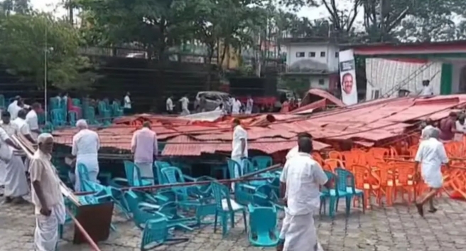 ബെന്നി ബെഹ്നാന് എംപി നയിക്കുന്ന യാത്രയുടെ ഉദ്ഘാടനം അല്പസമയത്തിനകം തുടങ്ങാനിരിക്കെയാണ് പന്തല് പൊളിഞ്ഞുവീണത്. പന്തലിനുള്ളില് കുടുങ്ങിയവര്ക്ക് നിസാരപരിക്കേറ്റിട്ടുണ്ട്. മറ്റ് ആളപായങ്ങളില്ല. എന്താണ് സംഭവിച്ചതെന്ന് അന്വേഷിക്കുമെന്നും വലിയ അപകടം ഒഴിവായത് ആശ്വാസമാണെന്നും ഡിസിസി പ്രസിഡന്റ് മുഹമ്മദ് ഷിയാസ് പറഞ്ഞു. സ്ഥിരമായി പന്തല് ഇടുന്നവര് തന്നെയാണ് ഇവിടെയും പന്തല് ഇട്ടത്. പരിപാടി കൃത്യസമയത്ത് നടക്കുമെന്നും ഷിയാസ് വ്യക്തമാക്കി.