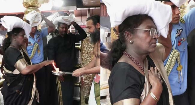 ശബരിമലയിലെത്തി രാഷ്ട്രപതി ദ്രൗപതി മുർമു അയ്യപ്പ ദര്ശനം നടത്തി. ഇരുമുടിക്കെട്ടുമായി പതിനെട്ടാംപടി ചവിട്ടിയാണ് അയ്യപ്പ ദർശനം പൂർത്തിയാക്കിയിരിക്കുന്നത്.