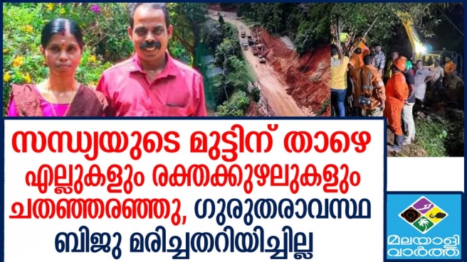 എങ്കിലും ഇനിയുള്ള 72 മണിക്കൂര് നിര്ണായകമാണെന്നാണ് ഡോക്ടര്മാര് പറയുന്നത്. ഓര്ത്തോ, പ്ലാസ്റ്റിക് സര്ജറി, ജനറല് സര്ജറി, അനസ്തേഷ്യ വിഭാഗങ്ങളിലെ ഡോക്ടര്മാരുടെ നേതൃത്വത്തിലായിരുന്നു ശസ്ത്രക്രിയ. വലതുകാലിലെ പേശികളും ചതഞ്ഞിട്ടുണ്ട്.അതേസമയം, മണ്ണിടിച്ചിലില് മരിച്ച സന്ധ്യയുടെ ഭര്ത്താവ് ബിജുവിന്റെ (46) മൃതദേഹം തറവാട്ട് വളപ്പില് സംസ്കരിച്ചു. ബിജു മരിച്ച വിവരം സന്ധ്യയെ അറിയിച്ചിട്ടില്ല. ഒരു വര്ഷം മുമ്പ് അസുഖ ബാധിതനായ ബിജുവിന്റെ മകന് ആദര്ശ് മരിച്ചിരുന്നു. കുടുംബം ഈ ദുഃഖത്തില്നിന്ന് കരകയറുന്നതിന് മുമ്പാണ് ഈ ദുരന്തമുണ്ടായിരിക്കുന്നത്.