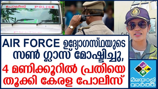 വീണ്ടും നമ്മുടെ കേരള പോലീസ്.. എയര്ഫോഴ്സിന്റെ സണ്ഗ്ലാസ് മോഷ്ടാവിനെ കേരളാ പോലീസ് പിടികൂടിയത് അതിവേഗം... കേസ് തെളിയിക്കാന് പോലീസിന് വേണ്ടി വന്നത് വെറും 4 മണിക്കൂര്..