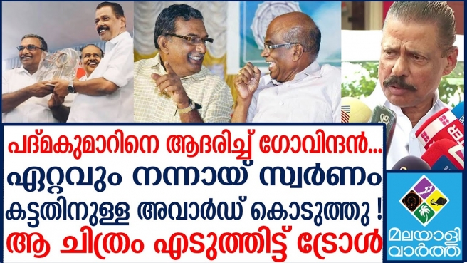 പദ്മകുമാറിനെ ആദരിച്ച് ഗോവിന്ദന്... ഏറ്റവും നന്നായ് സ്വര്ണം കട്ടതിനുള്ള അവാര്ഡ് കൊടുത്തു ! ആ ചിത്രം എടുത്തിട്ട് ട്രോള്