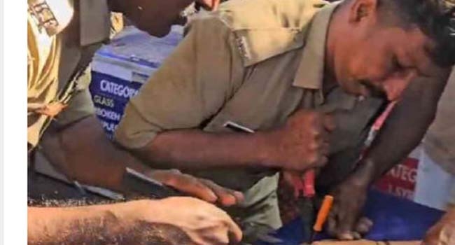 സ്കൂള് ഗ്രൗണ്ടില് കളിക്കുന്നതിനിടെ വിദ്യാര്ഥിയുടെ കൈപ്പത്തിയിൽ പലകസഹിതം ആണി തുളഞ്ഞുകയറി. ഉടന്തന്നെ കുട്ടിയെ ജില്ല ആശുപത്രിയിലെത്തിച്ചെങ്കിലും ആണിയും പലകയും നീക്കാനായില്ല. ആശുപത്രി അധികൃതര് അറിയിച്ചതിനെ തുടര്ന്ന് കാഞ്ഞങ്ങാട്ടുനിന്ന് അഗ്നിരക്ഷാസേനയെത്തി കുട്ടിയെ രക്ഷപ്പെടുത്തി.