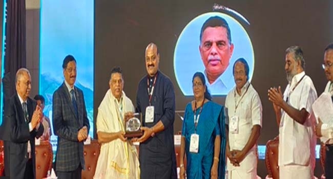 കോഴിക്കോട് നടക്കുന്ന സതേണ് ഡയറി ആന്ഡ് ഫുഡ് ഉച്ചകോടിയില് വച്ച് സംസ്ഥാന ക്ഷീരവികസന-മൃഗസംരക്ഷണ മന്ത്രി ജെ ചിഞ്ചുറാണിയുടെ സാന്നിദ്ധ്യത്തില് ആന്ധ്രാപ്രദേശ് ആന്ധ്രാപ്രദേശ് കൃഷി-മൃഗസംരക്ഷണ വകുപ്പ് മന്ത്രി കിഞ്ചരാപ്പു അച്ചനായിഡു കെ എസ് മണിക്ക് പുരസ്കാരം സമര്പ്പിച്ചു.