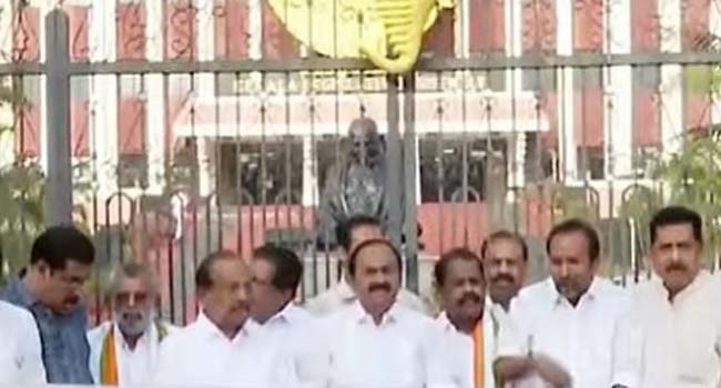 നിയമസഭയ്ക്ക് പുറത്ത് പ്രതിപക്ഷ പ്രതിഷേധം....ബാനര് പിടിച്ചായിരുന്നു പ്രതിഷേധം.