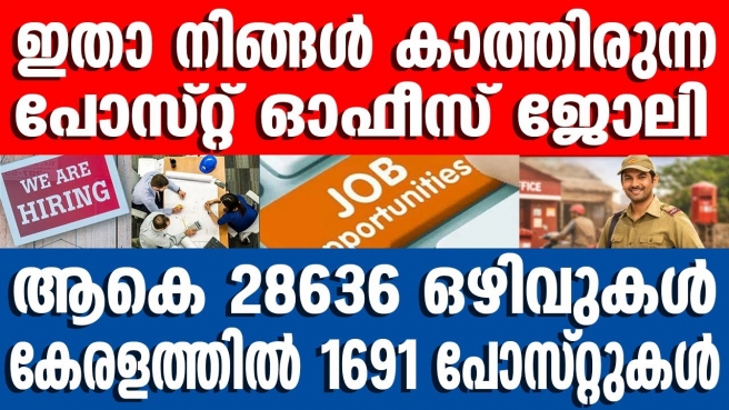 ഇതാ നിങ്ങൾ കാത്തിരുന്ന പോസ്റ്റ് ഓഫീസ് ജോലി ആകെ 28636 ഒഴിവുകള് കേരളത്തില് 1691 പോസ്റ്റുകൾ ഇതിലൊന്ന് നിങ്ങൾക്കാകാം