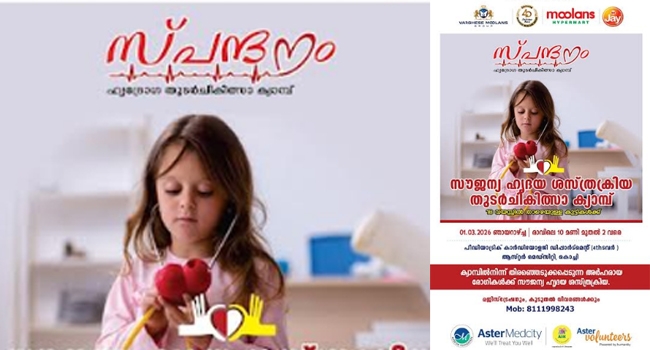 ആസ്റ്റർ മെഡ്സിറ്റിയും ഡോക്ടർ വർഗീസ് മൂലൻസ് ഗ്രൂപ്പും ചേർന്ന് കുട്ടികൾക്കായി സൗജന്യ ഹൃദയ ശസ്ത്രക്രിയ തുടർചികിത്സാ ക്യാമ്പ് 'സ്പന്ദനം' സംഘടിപ്പിക്കുന്നു. മാർച്ച് 1 ഞായറാഴ്ച്ച രാവിലെ 10 മണി മുതൽ 2 വരെ കൊച്ചി ആസ്റ്റർ മെഡ്സിറ്റിയിലെ പീഡിയാട്രിക് കാർഡിയോളജി ഡിപ്പാർട്മെന്റിൽ (4th ടവർ) വെച്ചാണ് ക്യാമ്പ് നടക്കുന്നത്. ക്യാമ്പിൽനിന്ന് തിരഞ്ഞെടുക്കപ്പെടുന്ന അർഹരായ രോഗികൾക്ക് സൗജന്യ ഹൃദയ ശസ്ത്രക്രിയ ലഭ്യമാക്കും.
