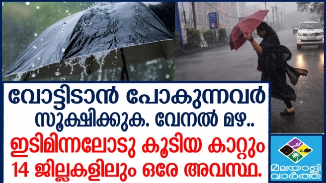 സംസ്ഥാനത്ത് ഒറ്റപ്പെട്ടയിടങ്ങളിൽ ഇന്ന് മുതൽ 11-ാം തീയതി വരെ ഇടിമിന്നലോടു കൂടിയ മഴയ്ക്കാണ് സാദ്ധ്യതയുണ്ടെന്നാണ് മുന്നറിയിപ്പ്.ഏപ്രില് 9 മുതല് 11 വരെ കേരളത്തിലുടനീളം ഒറ്റപ്പെട്ടയിടങ്ങളില് ഇടിമിന്നലോട് കൂടിയ മഴ തുടരാന് സാധ്യതയുള്ളതിനാല് പൊതുജനങ്ങള് പ്രത്യേക ജാഗ്രത പാലിക്കണമെന്ന് അധികൃതര് നിര്ദ്ദേശിച്ചു.മത്സ്യത്തൊഴിലാളി ജാഗ്രത നിർദേശം..കേരള - കർണാടക - ലക്ഷദ്വീപ് തീരങ്ങളിൽ ഇന്ന് മത്സ്യബന്ധനത്തിന് തടസമില്ലെന്ന് കേന്ദ്ര കാലാവസ്ഥ വകുപ്പ് അറിയിച്ചു.വോട്ടിന് പോകുന്നവർ ശ്രദ്ധിക്കേണ്ടത്..