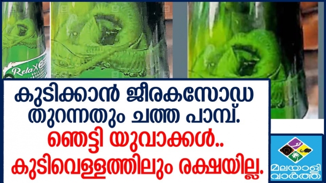 കുടിവെള്ളത്തിൽ പോലും രക്ഷയില്ല . കടയിൽ നിന്ന് വാങ്ങിയ ജീരകസോഡയുടെ കുപ്പിയിൽ ചത്ത പാമ്പിൻകുഞ്ഞ്. കോണത്തുകുന്ന് മനയ്ക്കപ്പടിയിലെ ഇന്ത്യൻ ഫാസ്റ്റ് ഫുഡ് എന്ന തട്ടുകടയിൽ നിന്ന് ചെറായി സ്വദേശി ഉണ്ണിയൻ പുരയ്ക്കൽ വിഷ്ണുരാജ്, ആലുവ സ്വദേശി ഡിനൂസ് എന്നിവർ വാങ്ങിയ സോഡാകുപ്പികളിൽ ഒന്നിലാണു പാമ്പിനെ കണ്ടത്. കോണത്തുകുന്ന് വള്ളിവട്ടം മനയ്ക്കപ്പടിയിലെ സ്വകാര്യ കമ്പനിയിൽ സോളർ പാനലിന്റെ ജോലിക്ക് എത്തിയതായിരുന്നു.