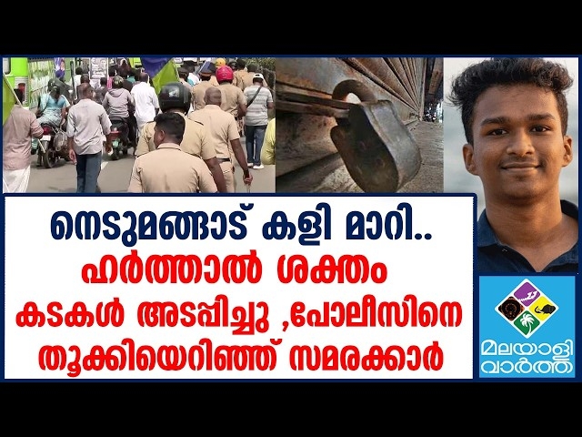 നെടുമങ്ങാട് കളി മാറി.. ഹർത്താൽ ശക്തം കടകൾ അടപ്പിച്ചു ,പോലീസിനെ തൂക്കിയെറിഞ്ഞ് സമരക്കാർ