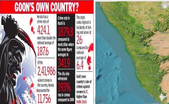 അക്രമങ്ങളുടെയും രക്തപാതകങ്ങളുടെയും രാജ്യതലസ്ഥാനമായി മാറി കൊണ്ടിരിക്കുകയാണ് ദൈവത്തിന്റെ സ്വന്തം നാടെന്ന് അഭിമാനിച്ചിരുന്ന കേരളം. ഉത്തരേന്ത്യയിലെ മോശപ്പെട്ട സ്ഥലങ്ങളെന്ന് ഇതുവരെ കരുതിയിരുന്ന ഉത്തര്പ്രദേശും ഡല്ഹിയുമെല്ലാം ആ കാര്യത്തില് കേരളത്തിനു പിന്നിലേ വരൂ എന്ന നിലയിലായിരിക്കുന്നു കേരളത്തിന്റെ ക്രമ സമാധാന നിലവാരം. ഇന്ത്യയിലെ ഏറ്റവും സുരക്ഷിതമല്ലാത്ത സ്ഥലം കേരളമാണെന്നാണ് ദേശീയ ക്രൈം റെക്കോര്ഡ്സ് ബ്യൂറോയുടെ ഏറ്റവും പുതിയ കണക്കുകള് വെളിവാക്കുന്നത്.