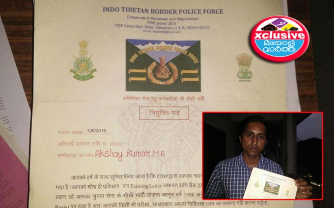 2014 ലാണ് ഐടിബിപി കോണ്സ്റ്റബിള് തസ്തികയിലേക്ക് അപേക്ഷ നല്കിയത്. ഒഡീഷയില് പരീക്ഷയെഴുതുന്നതിനുള്ള ഹാള് ടിക്കറ്റ് ലഭിക്കാന് വൈകിയതിനാല് പരീക്ഷയെഴുതുവാന് സാധിച്ചിരുന്നില്ല. പിന്നീട് രണ്ടു വര്ഷങ്ങള്ക്കു ശേഷമാണു 17-10 -2016 ല് ജോലിയില് പ്രവേശിക്കാന് കാണിച്ചുകൊണ്ടുള്ള കത്ത് വീട്ടില് ലഭിക്കുന്നത്. ആദ്യം അമ്പരന്നെങ്കിലും കൊടുത്തിരിക്കുന്ന നമ്പറില് ബന്ധപ്പെട്ടപ്പോള് 25000 രൂപ അടക്കണമെന്നു ആവശ്യപ്പെടുകയായിരുന്നു . താമസവും ഭക്ഷണവും ഏര്പ്പെടുത്തുന്നതിനായിട്ടാണ് ഈ തുകയെന്നു അറിയിച്ചു. 48 മണിക്കൂറിനുള്ളില് തുക അടക്കുകയാണെങ്കില് ഒരാഴ്ചക്കുള്ളില് ഉദംപൂരിലെ ക്യാമ്പില് പരിശീലനത്തിനായി ഉത്തരവ് ലഭിക്കുമെന്നാണ് അറിയിച്ചത്. തുടര്ന്ന് വിളിച്ചപ്പോള് ലഭിച്ച ബാങ്ക് അകൗണ്ട് നമ്പറുമായി ബന്ധപ്പെട്ട ബാങ്കില് അന്വേഷിച്ചപ്പോള് ഇത് ബീഹാര് സ്വദേശിയായ രാജീവ് സിംഗ് എന്നയാളുടെ പേരിലുള്ളതാണെന്ന് അറിയുവാന് കഴിഞ്ഞു. തുടര്ന്ന് ഡല്ഹിയിലുള്ള ബന്ധുവഴി നേരിട്ട് പണം നല്കാമെന്നു അറിയിച്ചപ്പോള് നേരിട്ട് പണം സ്വീകരിക്കാന് കഴിയില്ലെന്നും ബാങ്ക് അകൗണ്ട് വഴിപണമടച്ചാല് മാത്രമേ ജോലി ലഭിക്കൂ എന്നും അറിയിച്ചു. സംശയം തോന്നിയതിനാല്തുടര്ന്ന് നടത്തിയ അന്വേഷണത്തില് ഐടിബിപി മാന്പവര് റിക്രൂട്മെന്റ് ഉദംപൂര് എന്ന വിലാസത്തില് നിന്നും അയച്ചിരിക്കുന്ന കത്ത് തപാല് ചെയ്തിരിക്കുന്നത് ഹരിയാനയിലെ ഫരീദാബാദില് നിന്നാണെന്നു തപാല് സീലില് നിന്നും കണ്ടെത്തി. കൂടാതെ വന്നിരിക്കുന്ന കത്തില് മേല്വിലാസവും ഇല്ലായിരുന്നു. അക്ഷയ് കുമാറിന്റെയും അച്ഛന്റെയും പേരുകളും ഫോണ്നമ്പറുമാണ് ഉണ്ടായിരുന്നത്. പോസ്റ്റുമാന് ഫോണ്നമ്പറില് ബന്ധപ്പെട്ടാണ് കത്ത് കൈമാറിയത്.