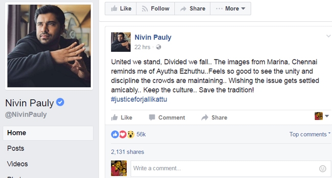 മലയാളികളെ പട്ടി കടിച്ചപ്പോള് നിങ്ങളെ കണ്ടില്ലല്ലോ എന്ന് തുടങ്ങുന്ന കമന്റുകള്ക്ക് അവസരം നല്കി നിവിന് പോളിയും ജല്ലിക്കെട്ടിനേപ്പറ്റിയുള്ള തന്റെ നിലപാട് തുറന്നുപറഞ്ഞിരിക്കുന്നു. 'ഒന്നിച്ചുനിന്നാല് നാം വിജയിക്കും ഭിന്നിച്ചാല് പരാജയപ്പെടും' ഫെയ്സ്ബുക്ക് പോസ്റ്റില് നിവിന് പോളി ഓര്മിപ്പിച്ചു. ചെന്നൈ മറീനയിലെ കാഴ്ച്ച എന്നെ ഓര്മിപ്പിക്കുന്നത് ആയുധ എഴുത്തിനെയാണ്. ജനക്കൂട്ടത്തിന്റെ ഒത്തൊരുമയും അച്ചടക്കവും കാണുമ്ബോള് വളരെ സന്തോഷമുണ്ട്. സമാധാനപരമായി പ്രശ്നം പരിഹരിക്കപ്പെടുമെന്ന് പ്രതീക്ഷിക്കുന്നു. സംസ്കാരം കാത്തുസൂക്ഷിക്കൂ പാരമ്ബര്യം സംരക്ഷിക്കൂ. നിവിന് പറഞ്ഞു. ജസ്റ്റിസ് ഫോര് ജല്ലിക്കട്ട് എന്ന ഹാഷ് ടാഗ് നല്കാനും നടന് മറന്നില്ല.