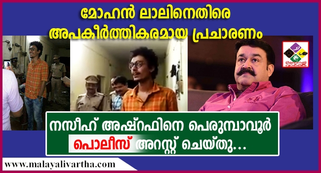 മോഹന് ലാലിനെതിരെ അപകീര്ത്തികരമായ പ്രചാരണം; നസീഹ് അഷ്റഫിനെ പെരുമ്പാവൂര് പൊലീസ് അറസ്റ്റ് ചെയ്തു...
