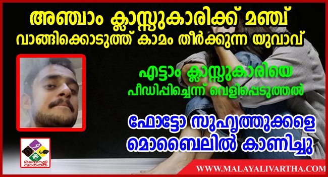 അഞ്ചാം ക്ലാസ്സുകാരിക്ക് മഞ്ച് വാങ്ങിക്കൊടുത്ത് കാമം തീര്ക്കുന്ന പോസ്റ്റിട്ട യുവാവ്; എട്ടാം ക്ലാസ്സുകാരിയെ പീഡിപ്പിച്ചെന്നും അതിന്റെ ഫോട്ടോ സുഹൃത്തുക്കളെ മൊബൈലില് കാണിച്ചു കൊടുത്തുവെന്നും വെളിപ്പെടുത്തല്