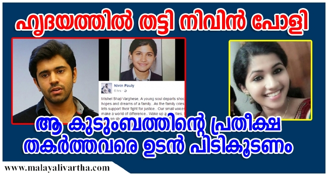 സിഎ വിദ്യാര്ത്ഥിനി മിഷേല് ഷാജിയുടെ അസ്വാഭാവിക മരണം അന്വേഷിക്കണമെന്ന വീട്ടുകാരുടെ ആവശ്യത്തിനു പിന്തുണ പ്രഖ്യാപിച്ച് നടന് നിവിന് പോളി