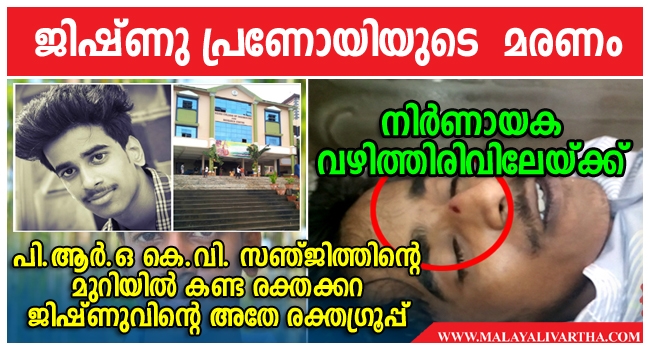പാമ്പാടി കോളേജ് പി.ആര്.ഒയുടെ മുറിയില് കണ്ട രക്തഗ്രൂപ്പ് ജിഷ്ണുവിന്റേതിന് സമാനം; കേസ് നിര്ണായക വഴിത്തിരിവിലേയ്ക്ക്