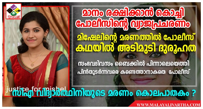 മാനം രക്ഷിക്കാന് കൊച്ചി പോലീസിന്റെ വ്യാജ പ്രചരണം; മിഷേലിന്റെ മരണത്തില് പോലീസ് കഥയില് അടിമുടി ദുരൂഹത