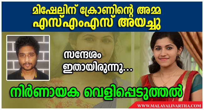 മിഷേലിന് ക്രോണിന്റെ അമ്മ എസ്എംഎസ് അയച്ചു സന്ദേശം ഇതായിരുന്നു.... നിര്ണായക വെളിപ്പെടുത്തല്